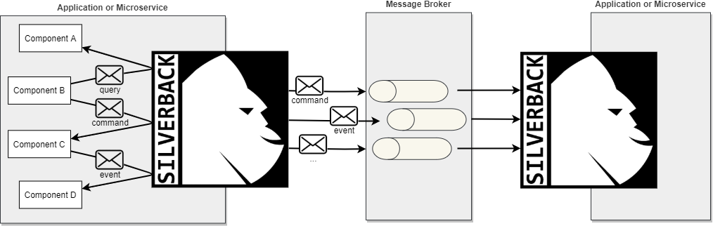 Silverback is essentially a bus that can be either used internally to an application or connected to a message broker to integrate different applications or microservices.